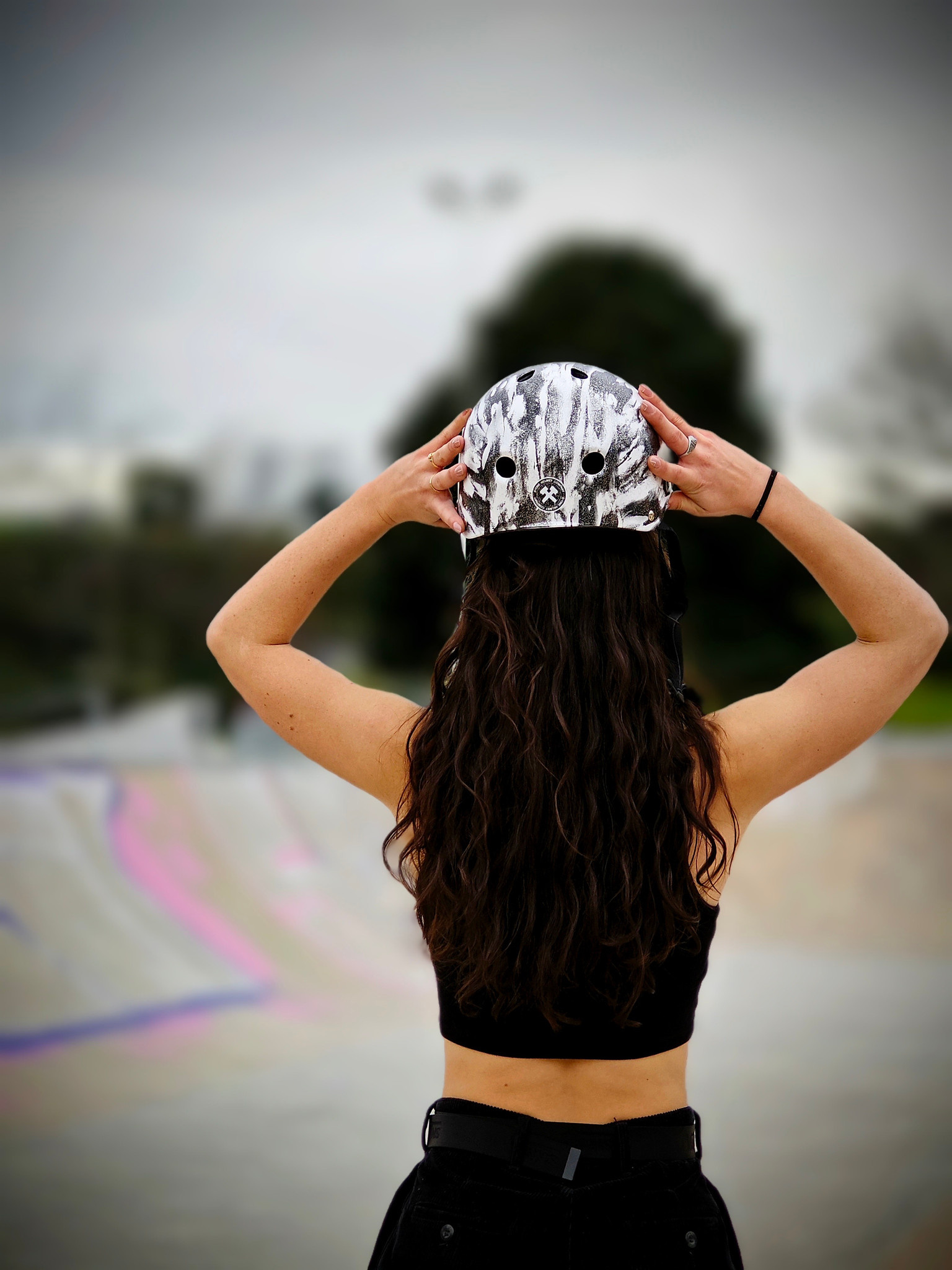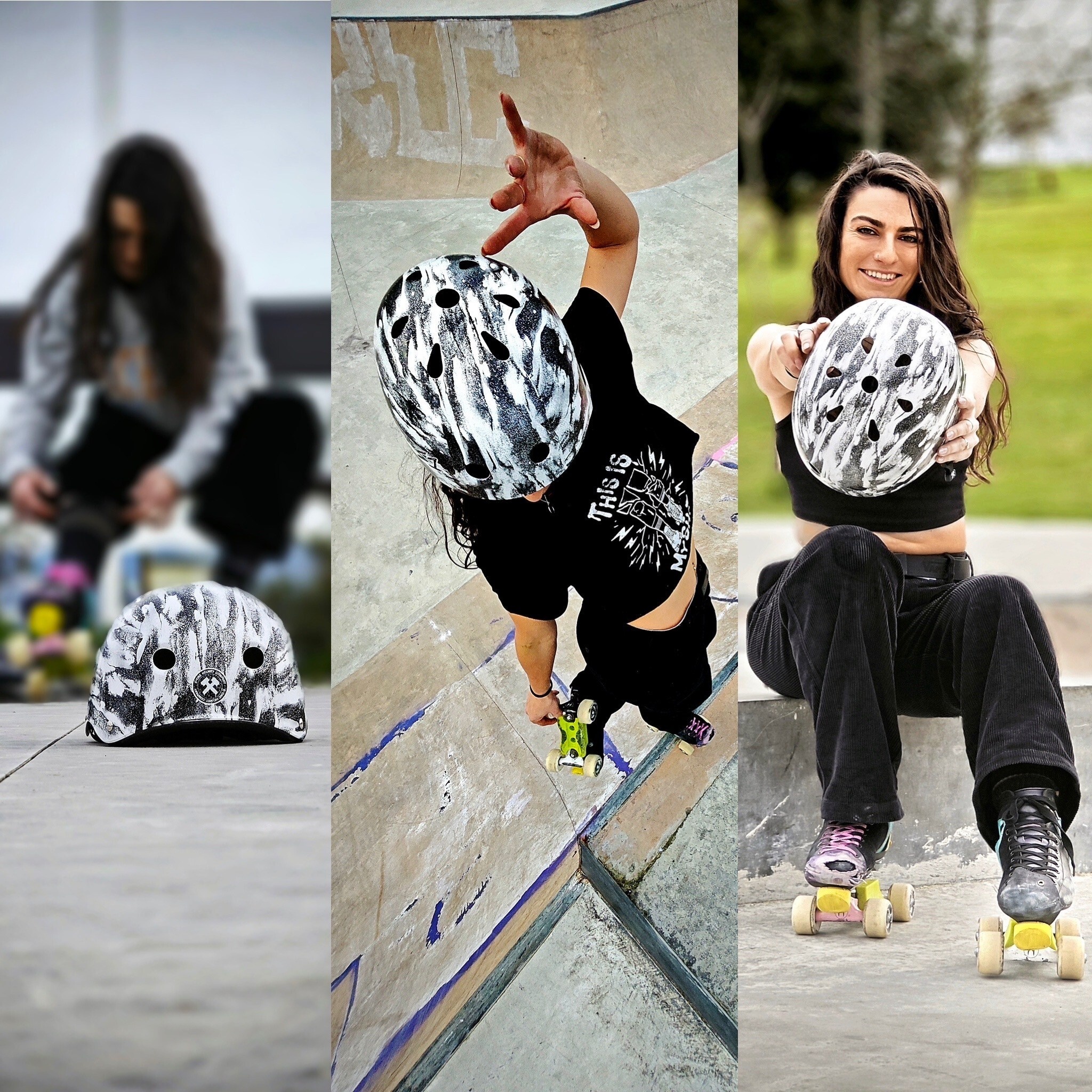 Over Bomba Hache: Bomba Hache is een van de meest iconische Roller Skaters van de nieuwe generatie. Bomba is de koningin van stijl en gratie op rolschaatsen en haar positieve vibe en soepele stijl verspreidt vreugde naar iedereen die ze tegenkomt. We zijn zeer vereerd om met Bomba samen te werken aan deze limited edition Collab S1 Lifer Helm x Bomba Hache Black White Glitter helm.